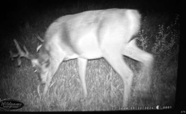 As September went on, I hunted our back field from a double tree stand almost every evening, hoping to catch a glimpse of Ricky. But we weren’t getting many pictures of him. It was frustrating—he wasn’t showing up consistently and didn’t seem to have a clear pattern. Then we noticed something: every picture we had of Ricky was exactly eight days apart. Like clockwork, he’d pass by one of our trail cams every eight days, patrolling his territory. But we still hadn’t seen him in person.