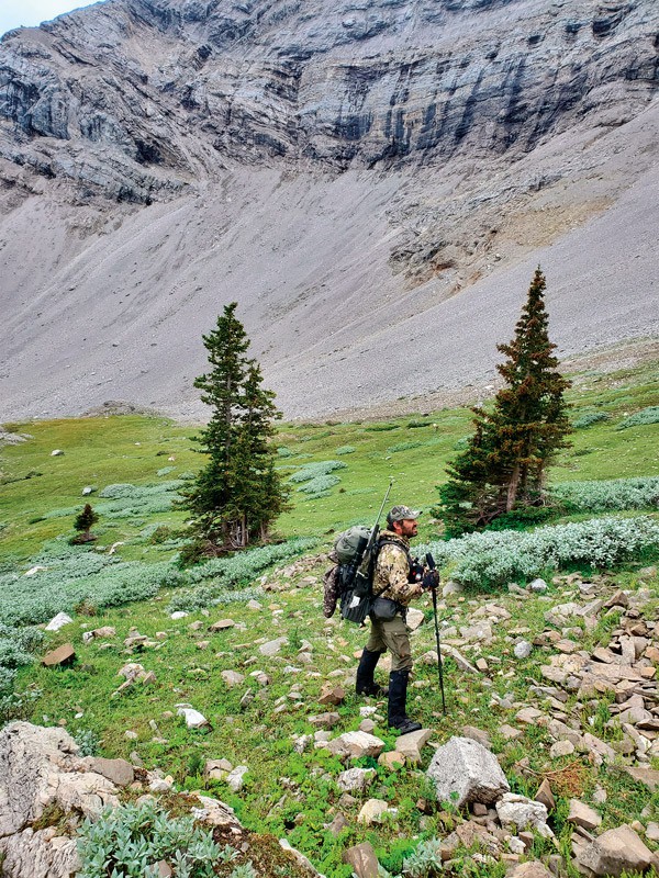 The terrain was perfect, and it was not long before we came to the last knoll between us and the rams. Handing Scotty the range-finding binos, I readied my rifle and chambered a round, trying to calm my breathing, as we cautiously approached the crest. Crawling the last few yards we came into the sight of the rams, and immediately knew the gig was up. At 323 yards and facing us head on, the old ram’s eyes bore a hole right through me as I struggled to find a steady rest on the steep side hill. The old rams don’t get old in the high-pressured zones of Alberta for no reason and while the young ram fed calmly below, the old boy had seen enough, turning to make his way straight back up the steep shale towards the safety of the cliffs above.